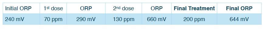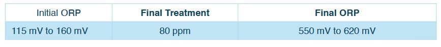 In the following weeks, as the system became progressively cleaner, the dosage of mineral oxychlorides was reduced with each visit. Only half of the dosed applied the previous week was necessary to stabilize the system at 644 mV. The free chlorine residual corresponding to the final ORP level was measured at 2 ppm.