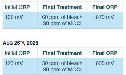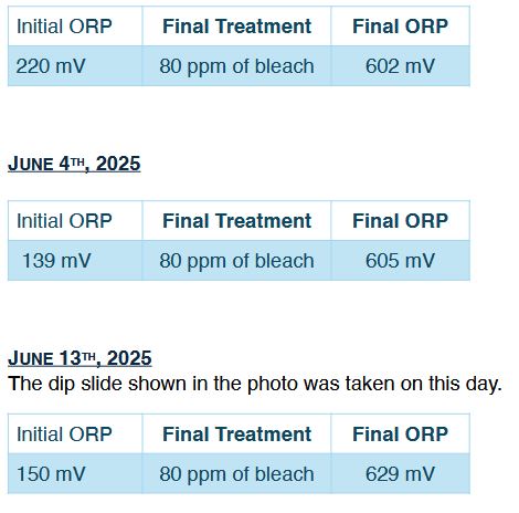 For experimental purposes, during the month of June the mineral oxychloride reagent was replaced with sodium hypochlorite. A dose of 80 ppm MOCI had proven effective over the previous six weeks, and this dosage was used as baseline to dose 12.5% sodium hypochlorite. The same monitoring was conducted. Water quality parameters, including ORP readings and chlorine residual, were within range. Therefore, the decision was made to maintain 80 ppm with the bleach trial.