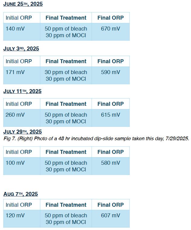 However, three weeks into the new protocol, dip-slide samples showed a sharp increase in bacterial growth, indicating a loss of microbial control. As a result, the trial was terminated prematurely, without completing the one month originally planned. Please see the data below. Note that based on the weekly ORP readings, there was no indication that biofilm was building up, and that bacterial colonization was not being controlled. Free chlorine residual readings, not shown here, were also within range.