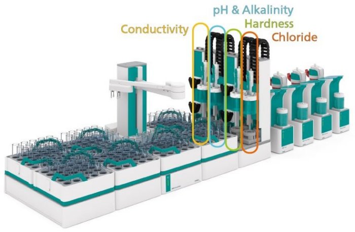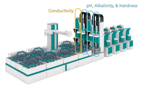 For example, the system shown here holds four dedicated workstations for the determination ofconductivity,pH and alkalinity,water hardness, as well aschloride. In this way it is ensured that each sensor is handled and stored in the most suitable way. Additionally, influences from one analysis to another can be completely avoided. With this system setup, a sample is either prepared separately for each station, or it can be passed from one station to the other.