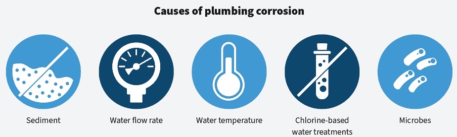 Corrosion significantly impacts the plumbing system, operations, maintenance, costs, and equipment. It can lead to pinhole leaks in the piping and pipe blowouts, which can ultimately cause water damage to the surrounding area. Corrosion can also cause loss of efficiency, reduction in performance, blockages, and total equipment failure of valves, pipes, pumps, and heaters.
