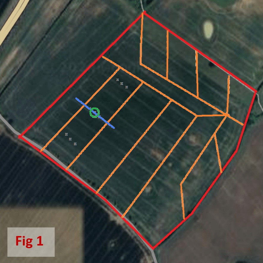 The red lines represent the boundaries, the orange lines represent the underground drainage carriers – and the small Xs represent the position of buried PR2 Profile Probe access tubes.