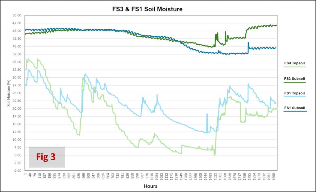 The PR2 data in (fig 3) below shows averaged topsoil (0-30 cms) and subsoil (40 – 100 cms) moisture measurements for field site 1 (10 years of no-till) & field site 3 (conventional tillage) over a period of three summer months.