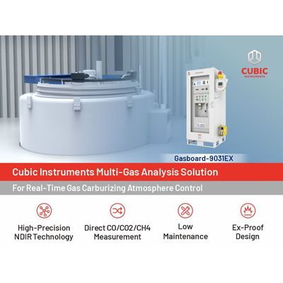 Acknowledging the industrial demands of real-time and accurate monitoring of reactive gas compositions within the furnace to achieve precise carbon potential control, Cubic Instruments, a leading manufacturer of gas sensors and gas analyzers, has specifically developed Gasboard-9031EX online gas monitoring system to meet the demands of high-precision gas monitoring and analysis applications.