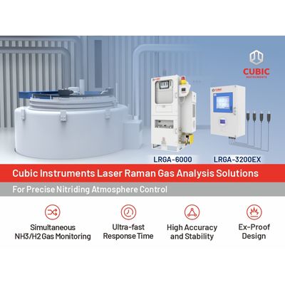 In response to the demanding requirements, Cubic Instruments provides advanced Laser Raman gas analysis solutions, LRGA-6000 and LRGA-3200EX, that deliver real time and precise gas composition monitoring. Both systems can measure multiple gas components including N2, H2, and NH3, which are precisely the key gases required for nitriding process control, enabling operators to achieve unprecedented gas atmosphere control over nitriding processes.