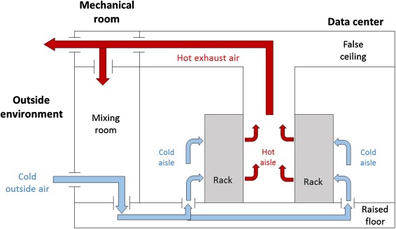 Direct air: Outside air passes through an evaporative cooler and is then flowed via filters to the data center cold aisle. When the outside temperature becomes too cold, it blends the outside air with exhaust air to achieve the desired temperature for the facility.