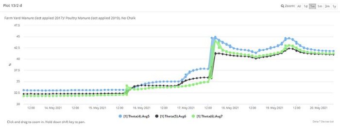 The sensor installation was completed in February 2020 with the loggers interrogating the sensors every minute and recording the average, maximum and minimum soil water content every hour for upload to Delta-T Devices’s online data viewing and sharing platform – DeltaLINK-Cloud. This meant that real-time data could be viewed by the Rothamsted team remotely on mobile smart devices. (Figure 4).