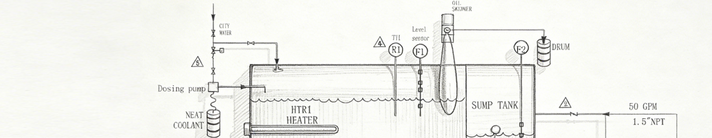 2.3 Pump P2 transfers the dirty coolant from the sump tank to the dirty tank, where it undergoes static separation, oil skimming, and particle sedimentation. After reheating, the coolant re-enters Step 1 for continuous circulation.