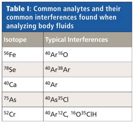 Spectroscopic interferences are caused by atomic or molecular ions that have the same mass-to-charge ratio as target analytes. Polyatomic ions commonly originate from a variety of sources including sample matrix, sample preparation reagents, plasma gases, and ambient gases. Common interferences in ICP-MS analysis can be seen in a number of elements such as iron (56Fe), selenium (78Se), calcium (40Ca), arsenic (75As), and chromium (52Cr) as a result of interference with polyatomic and isobaric species formed between argon (Ar), plasma ions (O, N, H), and other matrix ions (Cl, Na,Ca) (6) (see Table I).