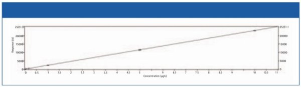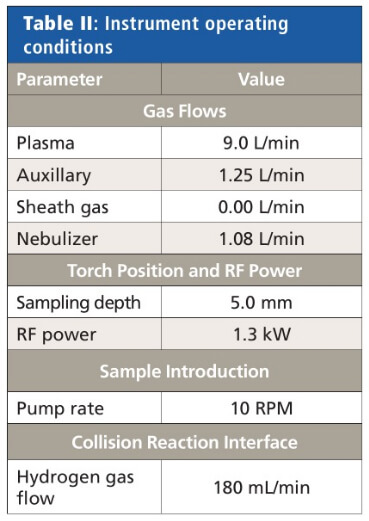 A five-level calibration curve was established that ranged from 0.1 to 10 μg/L (Figure 1). Instrument operating conditions are shown in Table II.