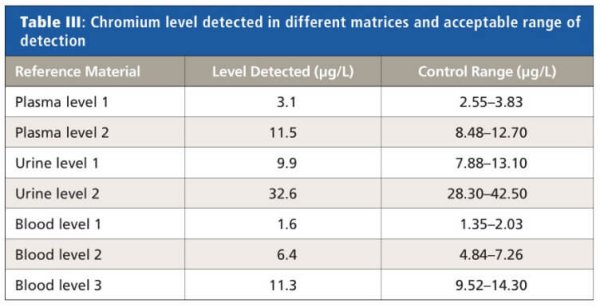Certified reference materials were used to determine accuracy and precision of detected amounts of chromium in blood, plasma, and urine matrices (ClinChek Whole Blood level I, II, and III, Plasma level I and II, and Urine level I and II, Recipe, Germany).