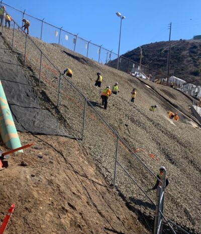 The actual rock size chosen for the infill was based on slope angle and site hydraulic conditions, with earth anchor pullout strength determined by the Engineer of Record based on the manufacturer´s recommended factor of safety and site soil conditions. Aggregate infill was placed from crest to toe, using a rock slinger to assist workers and limiting the drop of the infill to prevent geocell wall distortion, as seen in Figure 2 below.