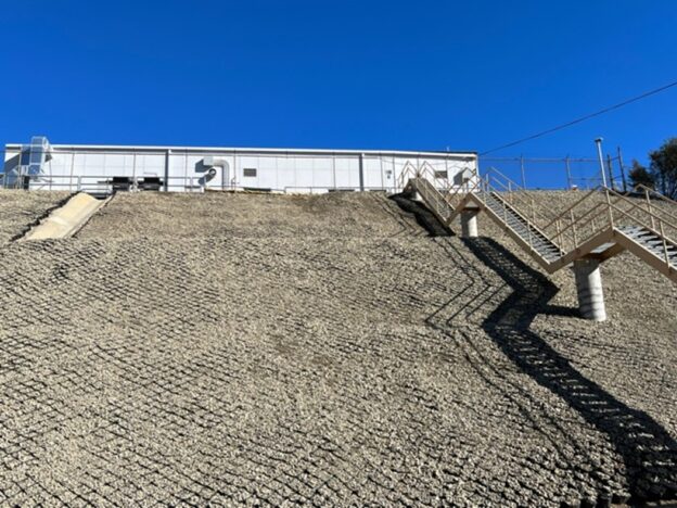 The project owner had recently completed facility renovations and needed to repair and protect the slopes and hillsides surrounding the facility. However, the project owner had attempted other vegetated and non-vegetated erosion control methods in the past, and due to recent wildfires, drought cycles, and heavy erosion, those previous efforts did not achieve the desired level of long-term protection. The project owner and their contractor sought to meet initiatives from the U.S. Department of Agriculture (USDA) Forest Service for land management practices designed to mitigate erosion before and after severe fire events, and in evaluating possible solutions, the GEOWEB® Geocell Slope Protection System was identified for further evaluation and analysis. GEOWEB Geocells are three-dimensional cellular confinement products made from strips of high-density polyethylene (HDPE) welded together to create an expandable honeycomb-shaped structure. The geocells confine the soil or aggregate fill, minimizing movement and migration of the embankment materials by functioning as anchored containers in the upper soil layer. The geocell system resists sheet flow, preventing severe erosion and controlling rill and gully formation, especially in erosive post-incendiary soils.