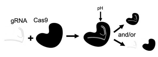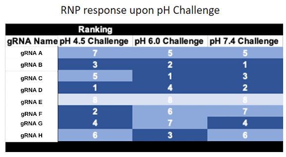 Performance of various gRNAs was ranked in relation to their activity in differing pH levels. These graphs compare RNP response of 8 different gRNAs at three different pH levels.