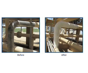 A produced water system operated in West Texas was experiencing accelerated internal degradation across multiple fittings-primarily elbows-due to high-solids loading and turbulent flow. Wall losses as high as 62% were confirmed via radiographic imaging. To prevent through-wall failure while deferring costly replacement InduMar`s WRC composite paste provided wear resistance while an overwrap with the Stop It fiberglass composite enhanced structural integrity.