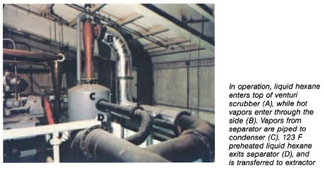 Results: The venturi scrubber and separator system has the flexibility to handle up to 850 cfm of vapors at a motive hexane flow rate of 375 gpm, or llOO cfm at 419 gpm, respectively. By reclaiming waste heat from hot vapors for preheating liquid hexane, Land 0′ Lakes estimates a savings of $28,000 in steam costs/yr in their extraction operation. Taking into account the total cost (venturi scrubber, separator, piping and ductwork modifications, pumps, and labor), the system paid for itself in about 15 mo.