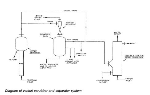 Solution: An equipment manufacturer was contacted regarding the possibility of employing venturi scrubbers. The manufacturer proposed use of a venturi scrubber and standard cyclonic separator to meet specific requirements of the process. Exact liquid hexane flow and vapor requirements were used as the design basis. Since the vapors from the second-stage evaporator are essentially pure hexane, the 2 streams (vapors and liquid) were contacted directly to condense hexane vapors and preheat liquid hexane-resulting in reduced steam consumption and cooling water loads. Liquid hexane was used as the driving force in the scrubber at a rate of 300 gpm entraining 410 cfm of hexane vapors at a negative 12″ suction draft.