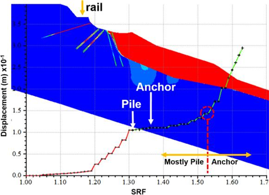 Itasca analyzed the complex structure interaction using several FLAC3D models, applying a Strength Reduction Method (SRM) approach. This method allowed development of performance charts for different levels of displacements and also provided important insight on the distribution of load between anchors and micropiles.