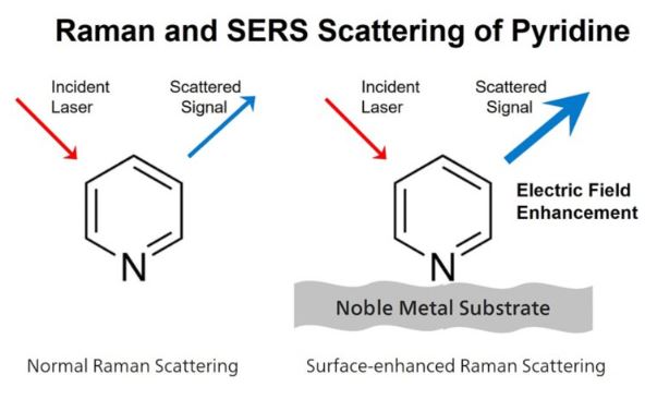 Surface-enhanced Raman scattering (SERS) is a specialized Raman technique that helps users detect trace amounts of substances. Not all materials are SERS-active, but strongly SERS-active materials can be detected at parts-per-million (ppm, mg/L) or parts-per-billion (ppb, µg/L) levels. SERS can also be used to detect a specific component in a mixture or identify strongly colored dyes and materials, as it is not susceptible to fluorescence.