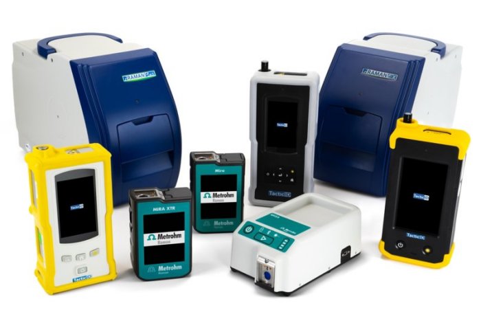 Raman spectroscopy can be used to identify most materials that are present at a sufficient quantity and purity and/or in simple mixtures. Raman can identify thousands of solid and liquid substances including pharmaceuticals, raw materials for food and personal care products, controlled substances and associated precursors and cutting agents, weapons of terror, toxic and non-toxic chemicals, solvents, and agricultural treatments (e.g., pesticides, insecticides).