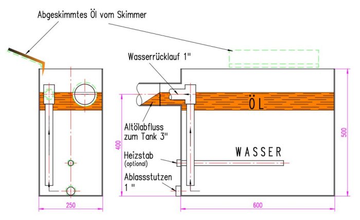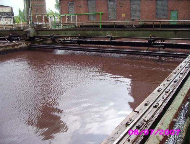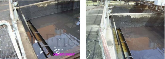 The specific weight of oil and grease is lower than the specific weight of water. For this reason oil and grease will settle on the surface of the water. The most part of the oil will settle on the longitudinal clarifier. The flow of the water in the longitudinal clarifier will drive the floating oil and fat to the outlet of the basin. The floating oil and grease will be stopped by a downflow baffle. The water floats underneath the downflow baffle into the pump chamber. From there the water will be pumped into the gravel filter and back into the factory. On the water surface in the longitudinal clarifier grease, lubrication oil, hydraulic oil and other hydrocarbons mixed with scale and particles, float on the water. It is extremely necessary to remove the floating hydrocarbons. Otherwise oil and grease will accumulate in the gravel filter and finally will block the gravel filter.