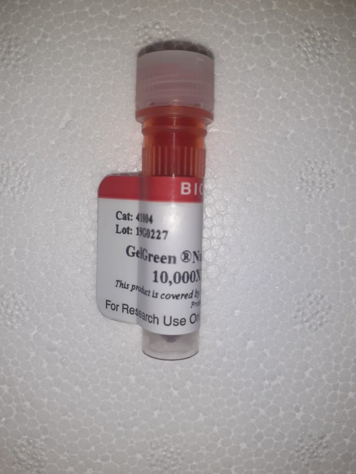 GelGreen is a fluorescent nucleic acid stain designed to replace highly toxic ethidium bromide (EtBr) for staining dsDNA, ssDNA or RNA in agarose gels or polyacrylamide gels.