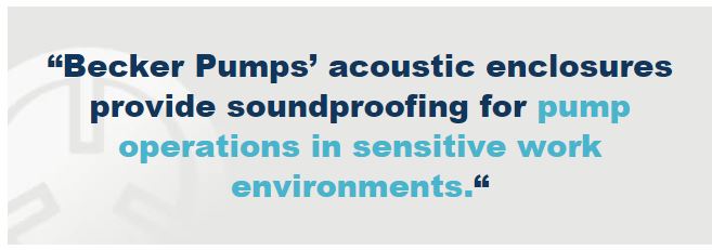 Becker Pumps’ acoustic enclosures provide soundproofing for pump operations in sensitive work environments, reducing stress, and the chance of permanent hearing damage. High noise absorption materials reduce vacuum pump noise by up to six times, without adversely affecting your vacuum pump efficiency.