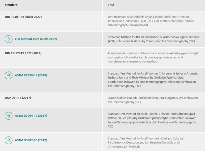 New applications for CIC are popping up everywhere with the rising need to monitor halogens and sulfur in several industries. As CIC has now matured into a reliable, automated analysis technique for these substances, it has become more commonly used to fulfill the analytical requirements of several international standards. A summary of recent standards is given in Table 1.