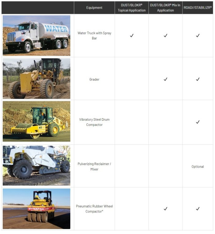 ROAD//STABILIZR® must be combined with proper construction techniques and protocols. Equipment required includes a grader, water truck, vibratory steel drum compactor, pulverizing reclaimer/mixer (optional) and a pneumatic rubber wheel compactor (recommended but can be replaced by any equipment with rubber tires).