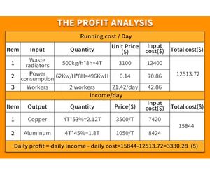 The aluminium, copper and iron recovered from AC radiator crushing and separating machine can be sent directly to the metal market to be sold for money. The table below is an analysis of the profitability of AC radiator crushing and separating machine.