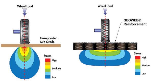 The geocell structure increases the load distribution angle and spreads vertical stresses over a larger area, which is commonly referred to as the mattress effect. This feature helps stabilize weak subgrades and prevents surface deformation, such as rutting or differential settlement, under heavy loads.