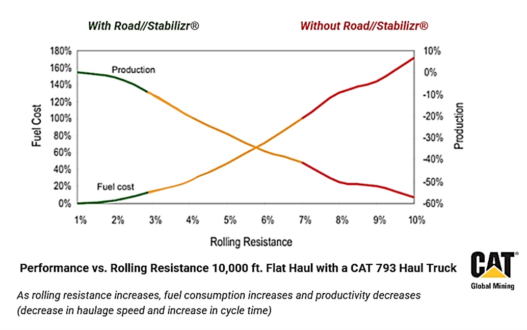 “I liken it to riding a bicycle with an under-inflated tire compared to one that’s properly inflated. It takes a lot more energy to pedal from point A to point B — and the same principle applies to massive haul trucks traveling on unstabilized, as compared to stabilized roads.”