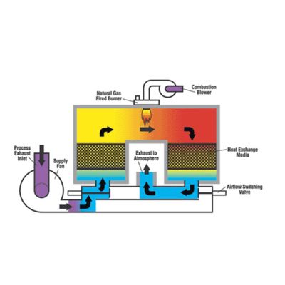 1. An RTO burns very lean waste gases without using much fuel. Operating temperature is about the same as a normal thermal oxidizer (say 1600oF), but the hot flue gas passes through a heat exchange module before reaching the stack. At least 2 of these modules are used -- one is always absorbing heat from the flue gas and one is always shedding heat into the waste gas. The modules are insulated boxes full of heat exchange media – usually ceramic packing. When a box has absorbed all the heat it can, it is taken offline and waste gas is sent through it backwards until it is cool again. Once cooled, it is taken offline and hot flue gas is again sent through it. Two boxes are needed so the flue gas always has a path to the exhaust stack – each box switches from heating to cooling every 5 minutes, or so. Specialized “Airflow Switching Valves”, set on a timer, are used to make the flow changes.