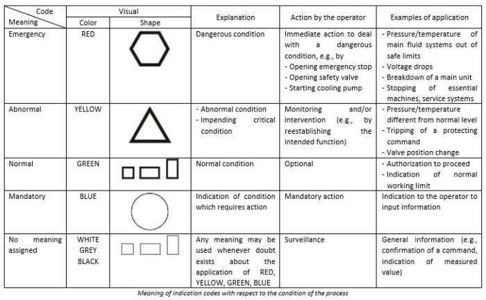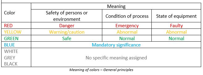 The colors YELLOW and GREEN should not be used. The color RED shall only be used in cases where the same actuator, other than a pushbutton, is used for both EMERGENCY STOP / OFF and normal operation.