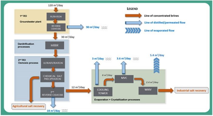An urgent solution was required, several local companies have teamed up together with the University of Cartagena to investigate a technological solution for the agricultural brines that endanger the Mar Menor and Mediterranean area: The process developed will remove nutrients and separate different salts from the brine that can be used as fertilisers. First, a double RO process generates a second RO brine which goes through a denitrification and chemical precipitation process for nutrient removal and salt separation. The RO process is followed by a thermal concentration process using a Cooling Tower and Mechanical Vapour Compression that concentrate the final brine to its final saturation condition. The final step is the removal of the precipitated salts, by Wind-Aided Intensified Evaporation, that can have applications in other industries. The result is known as a Zero-Liquid- Discharge solution: the environmentally unfriendly brine is converted into clean water for irrigation, fertiliser and salts for industry. When applied the Life Desirows process prevents the leakage of unwanted substances from agriculture into the water course. All processes are supplied by renewable electrical energy.