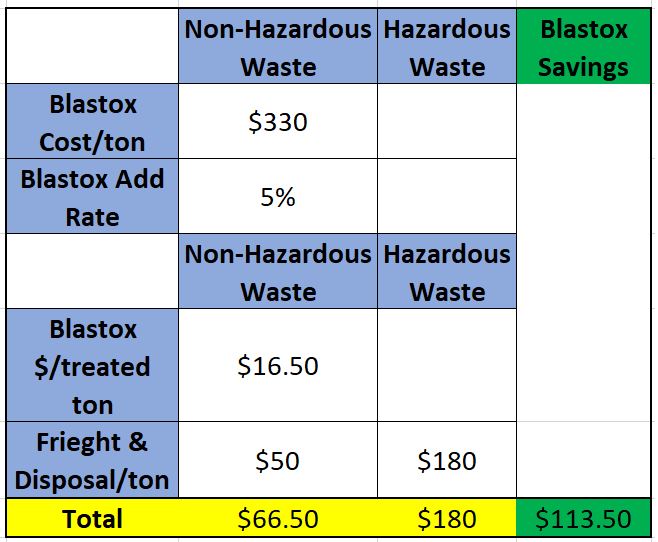 At these dose levels, the per ton treated cost ranges from $6.60 – $16.50 per ton of remediated soil. When compared to hazardous waste disposal, it’s clear that Blastox 215 is very cost effective heavy metal fixation reagent.