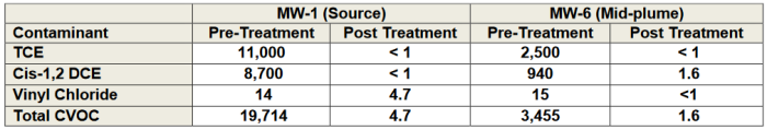 Following one year of bioaugmentation, the contaminant concentrations were reduced by more than 99%. The daughter products caused by incomplete natural breakdown were removed as well as the TCE. The following table shows the contaminant concentration trends in the treatment area.