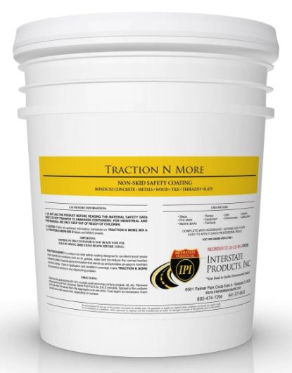 Interstate products also introduces Traction-N-More Bare Feet floor covering. This is a low pedestrian grade epoxy concrete non slip coating and meant to be not as course as the standard version while continuing to provide good traction while serving as a anti slip paint. Excellent for lighter jobs, bare feet or livestock applications.