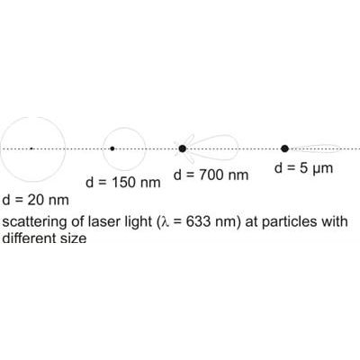 In static light scattering laser light (monochromatic, coherent light) interacts with the particles, which have to be characterized in terms of particle size. In dependence of the particles'size, the light waves are scattered by the particles in a characteristic manner: the larger the particles are, the greater is the scattering in forward direction. With particles smaller about 100 nm, the scattering intensity is nearly identical in all directions.