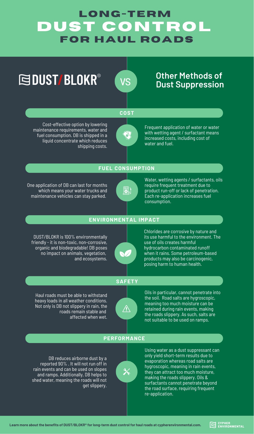 DUST/BLOKR® is Cypher Environmental’s innovative and ground-breaking long term dust control for haul roads. The solution presents an environmentally friendly alternative to traditional dust suppression methods like water, chlorides, oils, and wetting agents / surfactants. We have engineered a dust control solution that not only offers superior performance, but is non-corrosive, non-toxic and eco friendly.