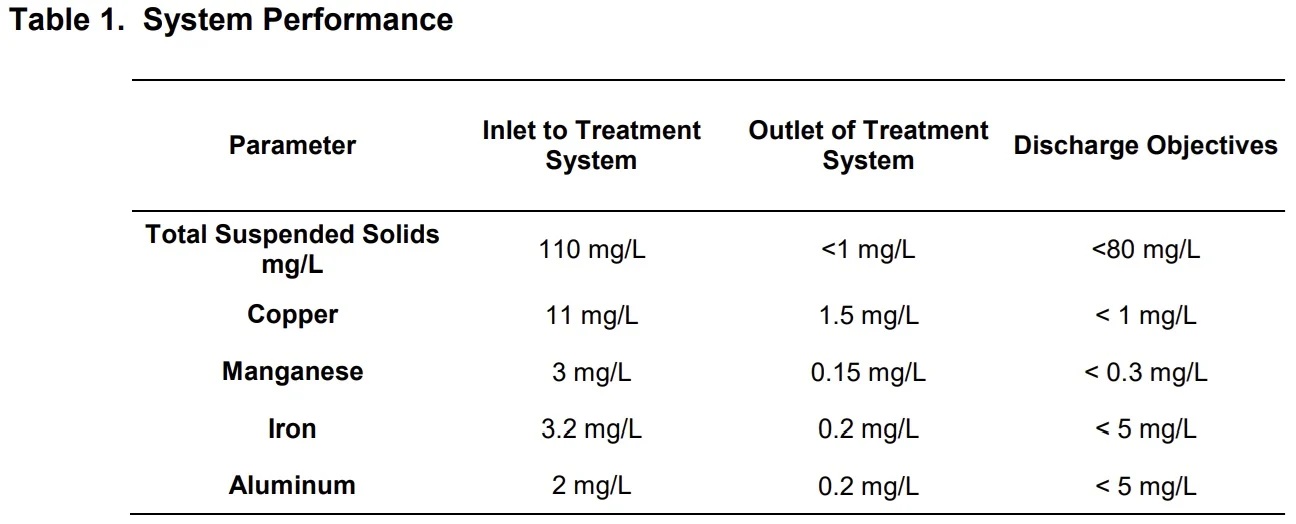 The main contaminants of concern in this application included TSS, copper, manganese, aluminum and pH.