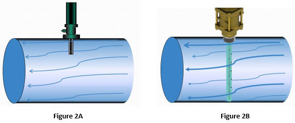 In contrast to partial-insertion mag meters, which measure flow across only a fraction of the pipeline cross section (Figure 2A), FPI mag meters calculate flow measurements at multiple locations across the full diameter of the pipeline (Figure 2B).