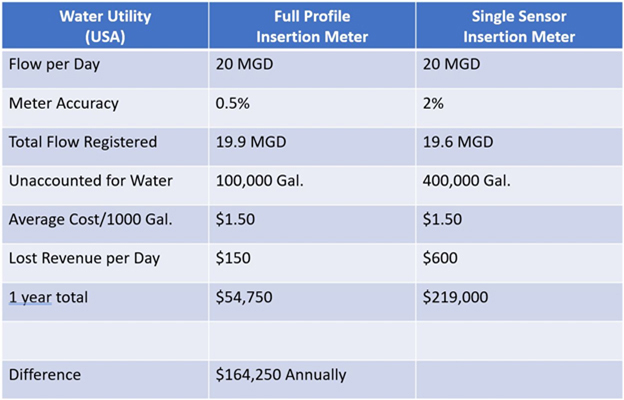 Figure 3. Just how much can 0.5 percent metering accuracy be worth? Implementing an FPI mag meter (at 0.5 percent accuracy) vs. a single-sensor insertion mag meter (at 2.0 percent accuracy) can reduce the volume of unaccounted water by up to $160,000 over the course of a year.