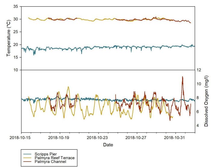 During daylight hours, photosynthesis levels are so high that DO levels often exceed 100% saturation and divers can actually watch oxygen bubbling out of the seawater. The sensors in Palmyra are attached to a living biological structure in relatively calm water, making photosynthesis (or its absence) the primary factor in DO levels.