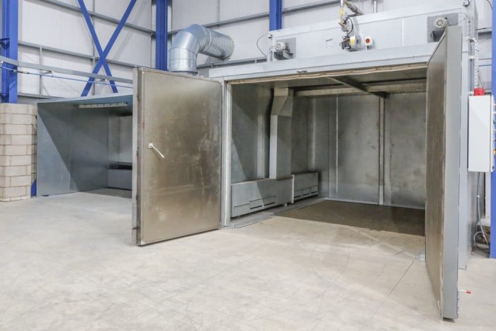 The Box ‘Batch’ Oven and Water Wash Booth are self-contained, free standing, and required no floor excavations or special floor preparations. The Oven has galvanised steel folded panels, with between 75mm and 150mm thick thermal insulation, and is designed for 100-400° C operating temperatures.