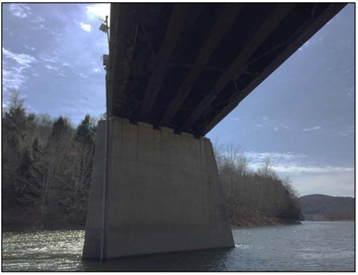 The sonde is suspended from the top of the bridge approximately 0.5 m above the riverbed, inside a 10 cm (4”) diameter deployment pipe by nylon cord and a communication cable. The deployment pipe was attached to the concrete bridge pier just below the 45-degree taper to the downstream point of the pier, ensuring a representative flow of water past the sonde while protecting it from debris flowing downstream.