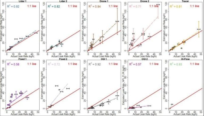 In the graph above, OGI 1 is a summary of Opgal’s QOGI results. Out of all the graphs on the bottom which include all bottom up and OGI technologies, Opgal’s EyeCSite QOGI software has the most consistent results (larger R2), and the larger number of recovered emission rate determinations (14 out of 17 total tests). In addition, the slope of the linear regression, for Opgal’s emission rate compared to actual releases, is the closest to the red line, which demonstrates the accuracy of Opgal’s QOGI determinations.