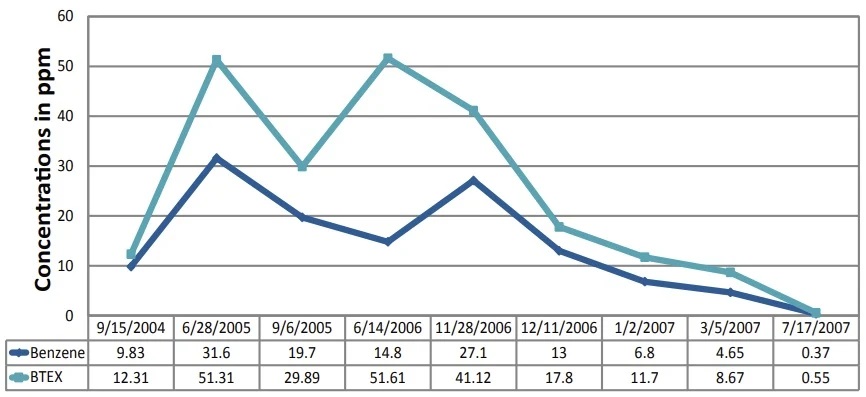 Sparging began in December of 2006. Results from monitoring indicated that BTEX levels dramatically decreased from the time that the system was installed. Results from monitoring well 8 are graphed showing the fluctuating background concentrations pre ozone and the decreasing trends from throughout the injection period. The site closed in 2008.