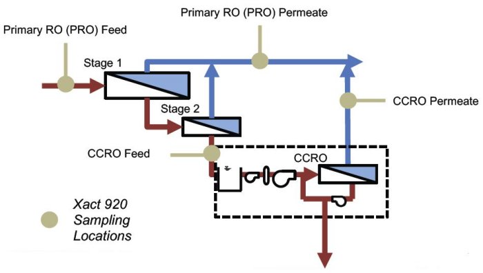 Data presented in this paper was collected over a two-month demonstration in 2021, with the Xact 920 configured to provide continuous 1-hr strontium measurements. The Xact 920 was installed at a pilot AWP facility capable of treating 100,000 gallons per day. The pilot plant was equipped with a 2-stage primary (PRO) and closed circuit secondary (CCRO) RO system which together achieves greater than 90% recovery. One Xact 920 was installed with an automatic switching manifold, allowing switching between four sample locations including; PRO Feed, PRO permeate, CCRO Feed (PRO Brine) and CCRO Permeate. Measuring these four locations allows LRV calculations (Equation 1) for both the primary and secondary RO systems. Figure 1 show the AWP RO treatment process and the Xact 920 sample locations.