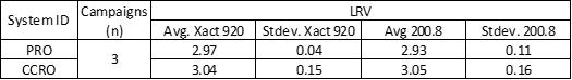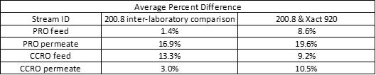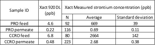 The same data used for percent difference analysis in total strontium concentration was also used to calculate the LRV for the PRO and CCRO systems. Table 3 summarizes the measured LRVs for the Xact 920 and EPA 200.8, while Table 4 shows the percent difference analysis for the LRV. The Xact 920 performance was equal to EPA 200.8, demonstrating the Xact 920 can be used for this application.